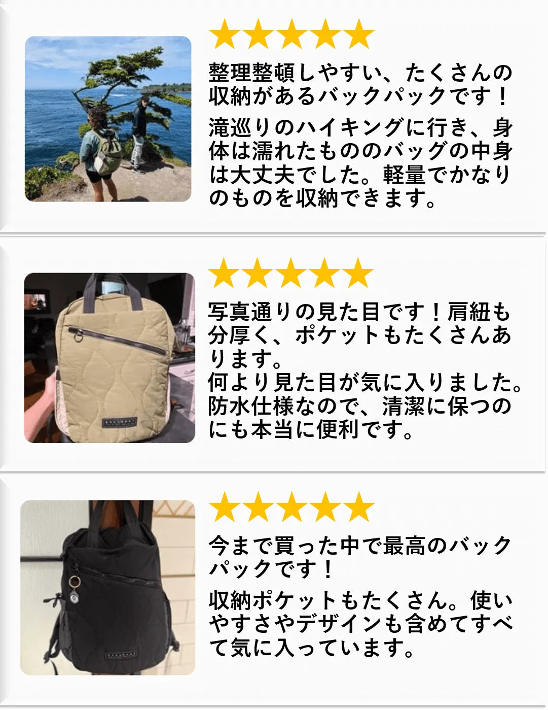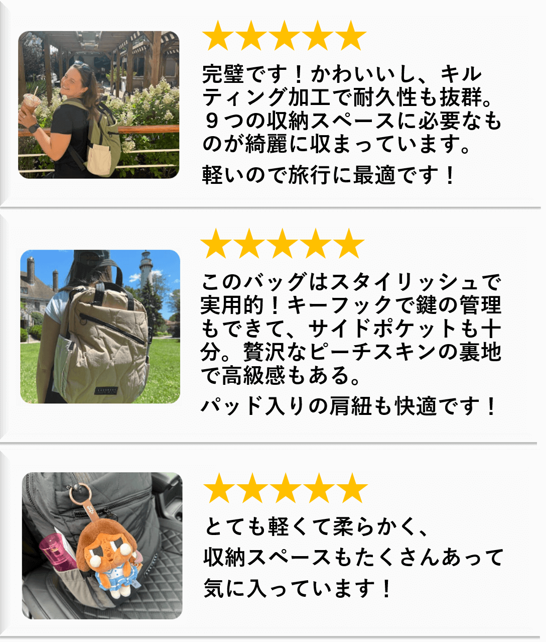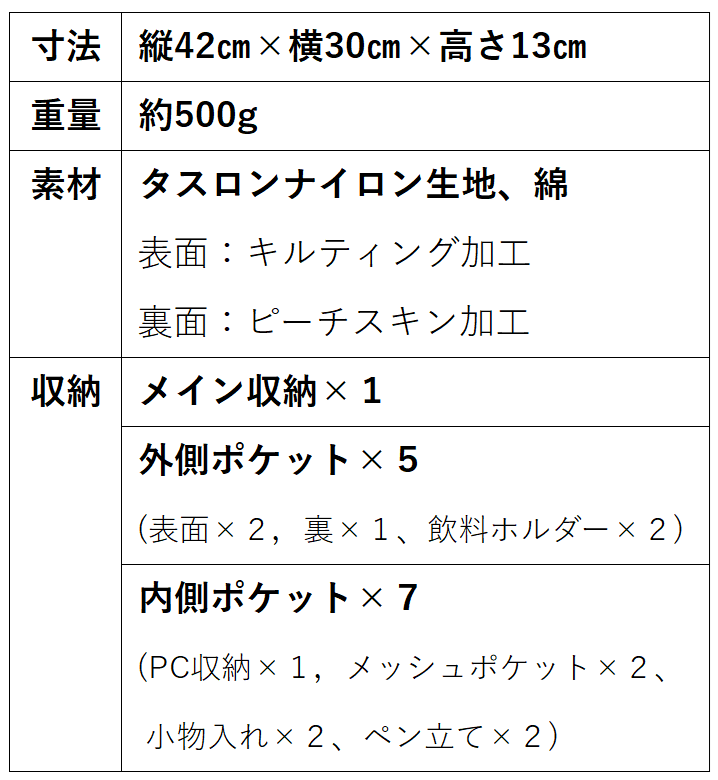 背負った瞬間、今までのリュックとの違いを感じました。軽いだけでなく、肩ベルトの形状が良いため、背中にフィットします。チャックの滑りも問題ないです。軽いのにふわふわの柔らかく厚い生地で、荷物が少なくても型崩れがしません。書類とその他のものが混ざってごちゃごちゃになることなく、中身が取り出しやすいです。追加で母にも購入するくらい良かったです!見た目は大きくみえないのに、かなり容量がありすばらしいです。